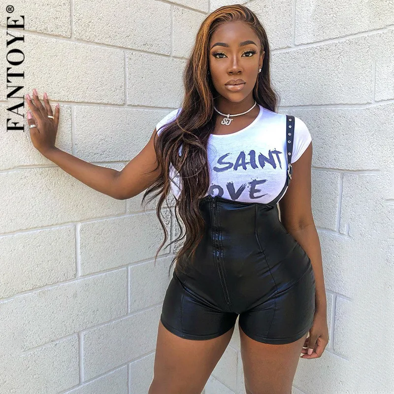✅ Женский Короткий комбинезон FANTOYE, черный облегающий комбинезон из искусственной кожи на молнии с открытой спиной для ночного клуба на лето