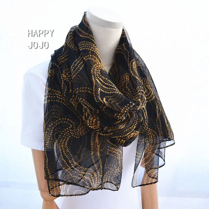 ✅ Женский прозрачный шарф из натурального шелка, черный шарф с принтом и желтыми точками, очень тонкий Дамский светильник на весну и лето