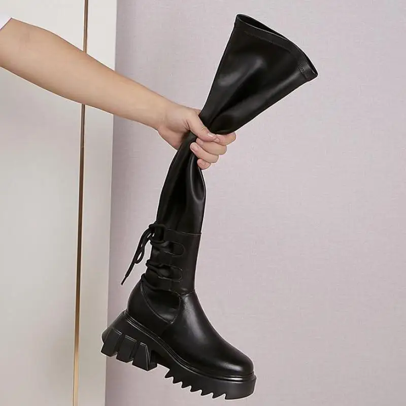 ✅ Облегающие высокие сапоги на плоской подошве, женские облегающие сапоги выше колена на платформе, женская обувь, черные зимние длинные сапо...