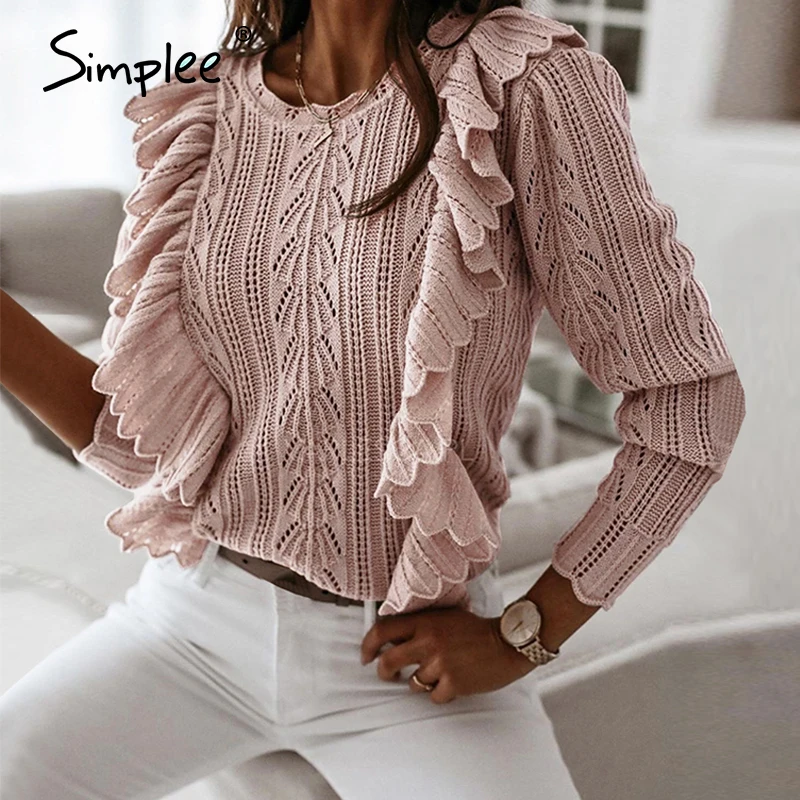 ✅ Женский вязаный свитер Simplee, Розовый пуловер с длинным рукавом и оборками на осень и зиму
