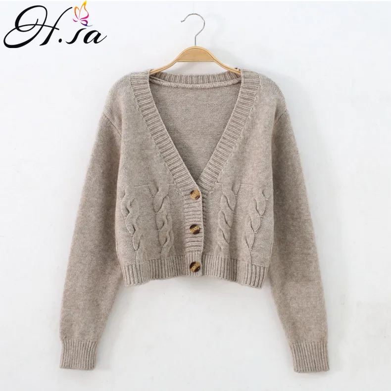 ✅ Женский короткий кардиган с пуговицами H.SA, повседневный трикотажный черный кардиган с v-образным вырезом, осень 2020