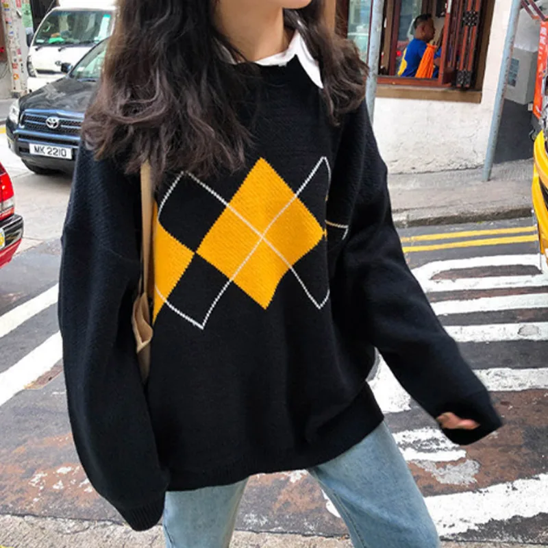 ✅ Женские контрастные свитера с рисунком ромбиками, теплые женские пуловеры оверсайз с длинным рукавом и круглым вырезом, милый женский свит...