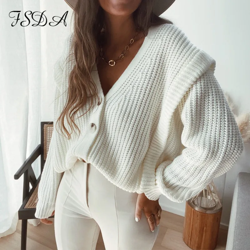 ✅ FSDA белый женский кардиган с v-образным вырезом, Осень-зима, длинный рукав, свободная пуговица, 2020, Свободный Повседневный джемпер, вязаный же...