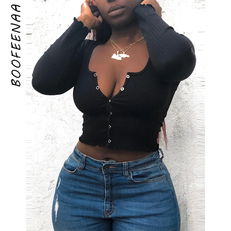 ✅ Женский вязаный кардиган BOOFEENAA, однотонный кардиган на пуговицах с длинным рукавом, повседневные Сексуальные облегающие футболки для осени 2020 C85-BZ14