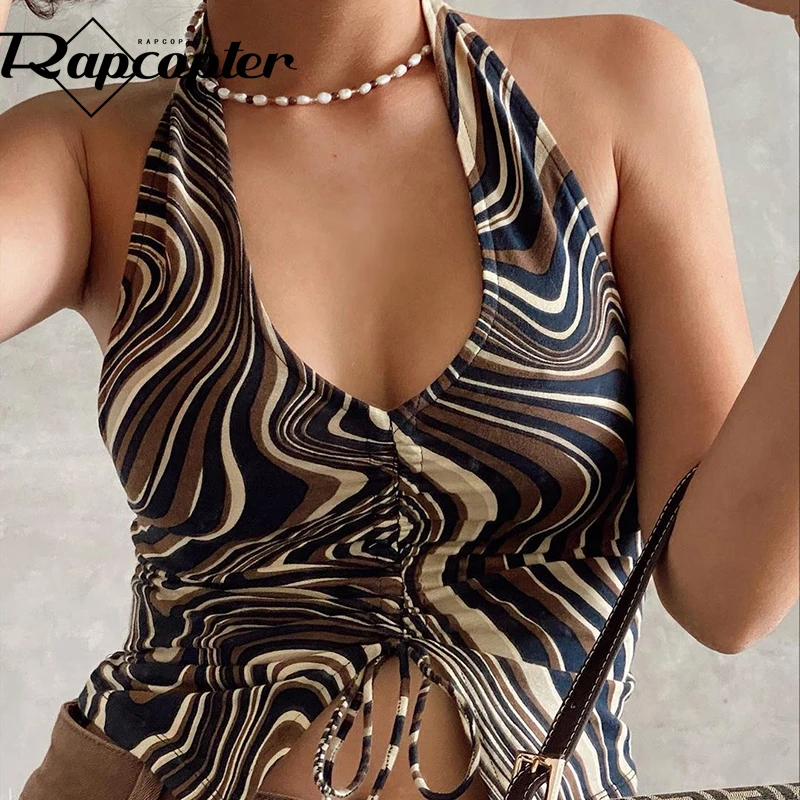 ✅ Rapcopter Пейсли укороченный топ со сборками и завязками в y2k майки V образным вырезом Топ c бретелькой через шею Для женщин 2021 новые летние Корсет Топ Harajuku майка милые 90s