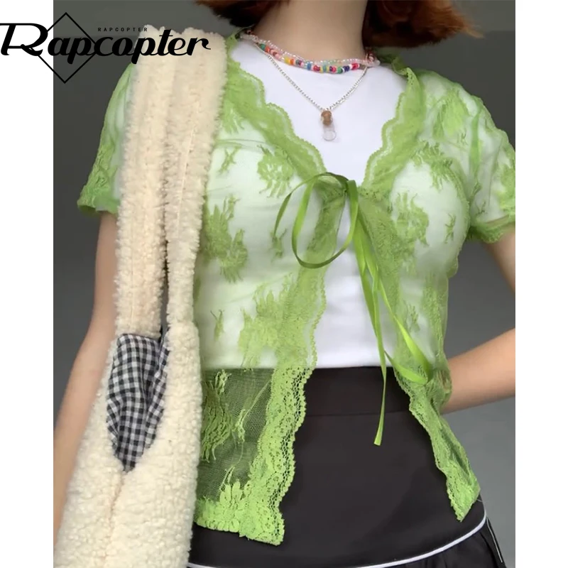 ✅ Rapcopter печатных укороченный топ y2k модная футболка прозрачной сетки футболка для женщин в винтажном стиле жабо Pulovers Harajuku уличная 90s