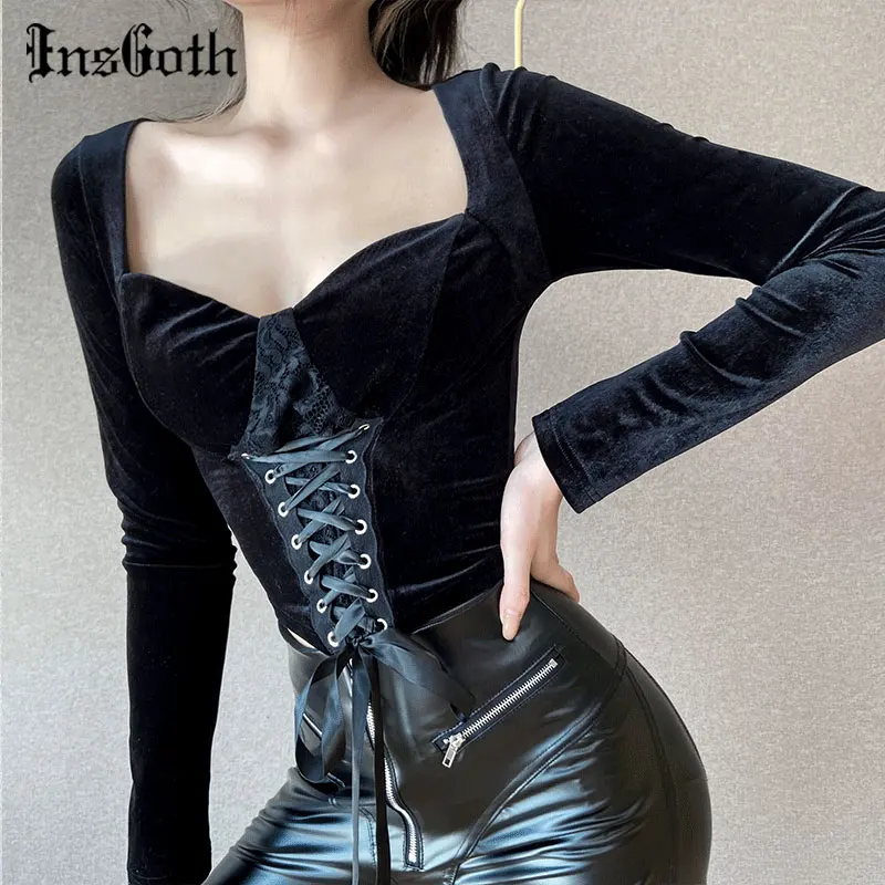 ✅ Винтажная кружевная черная футболка InsGoth, Готическая Эстетическая Вельветовая футболка с длинным рукавом, женские Сексуальные облегающие Топы с длинным рукавом в стиле Харадзюку