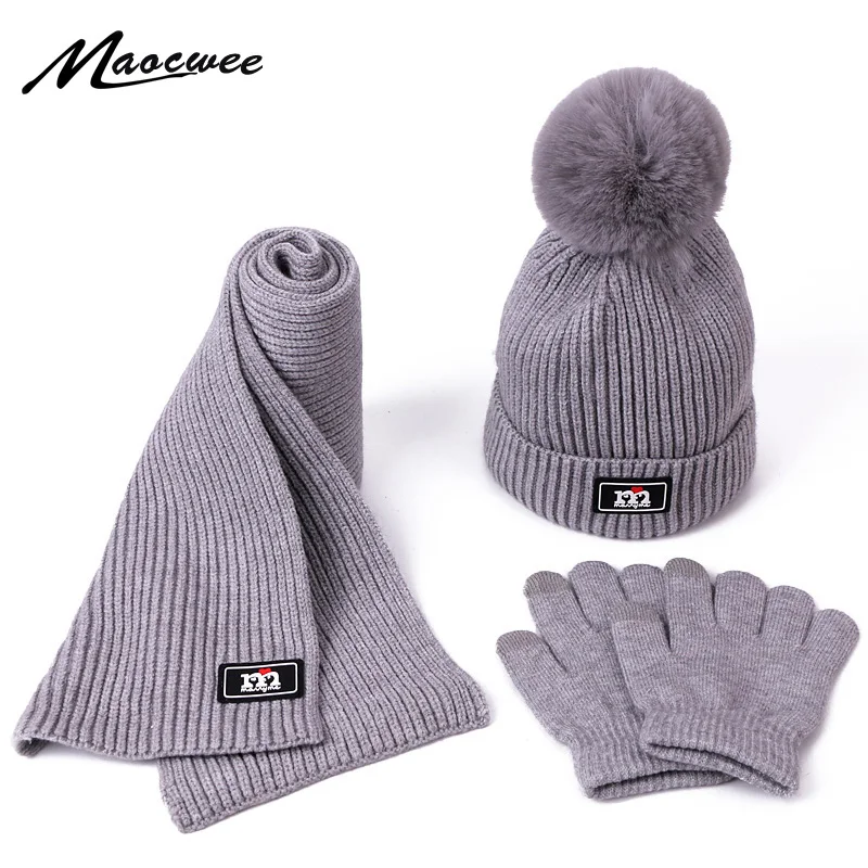 ✅ Зимняя детская шапка, шарф, перчатки, Комплект из 3-х предметов, теплая вязаная плюшевая шапка, шарфы и сенсорные перчатки, аксессуары для мал...