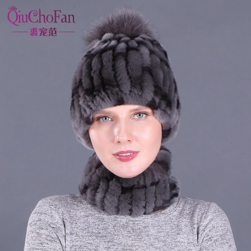 ✅ Комплект из 2 предметов, новая зимняя шапка с помпоном из кроличьего меха и шарф для женщин и девочек, хлопковая зимняя вязаная шапка, повсед...