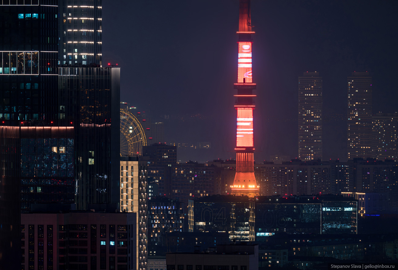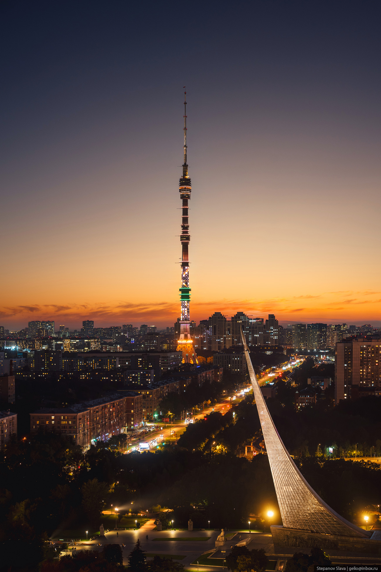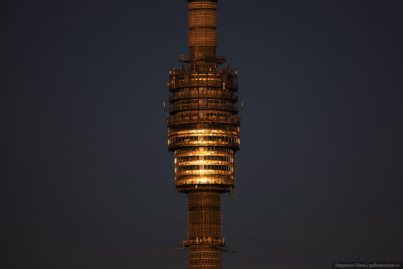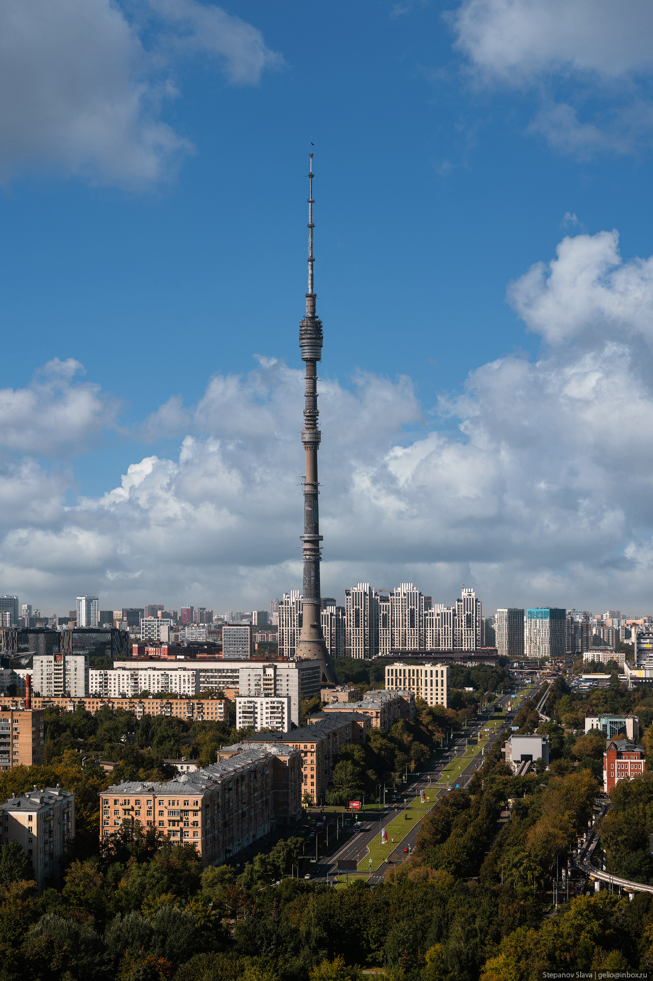 Высота Останкинской телебашни более 540 метров, толщина стен у основания всего 50 см, диаметр основания — 60 метров. Конструкция опирается на 10 опор, за жесткость и устойчивость к ветровым нагрузкам отвечают 145 стальных канатов, натянутых с усилием 70 тонн. На высоте 328-334 метра расположен первый в СССР вращающийся ресторан «Седьмое небо», над ним — закрытая и открытая смотровые площадки, с которых открывается вид на всю Москву.