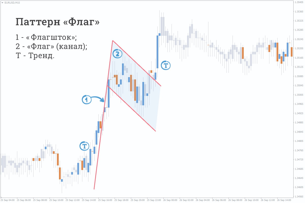Фигура «Флаг» — инструмент технического анализа, прогнозирующий продолжение текущей рыночной тенденции (тренда). Состоит из двух частей: «флагштока» и флага (канала, в котором движется цена).