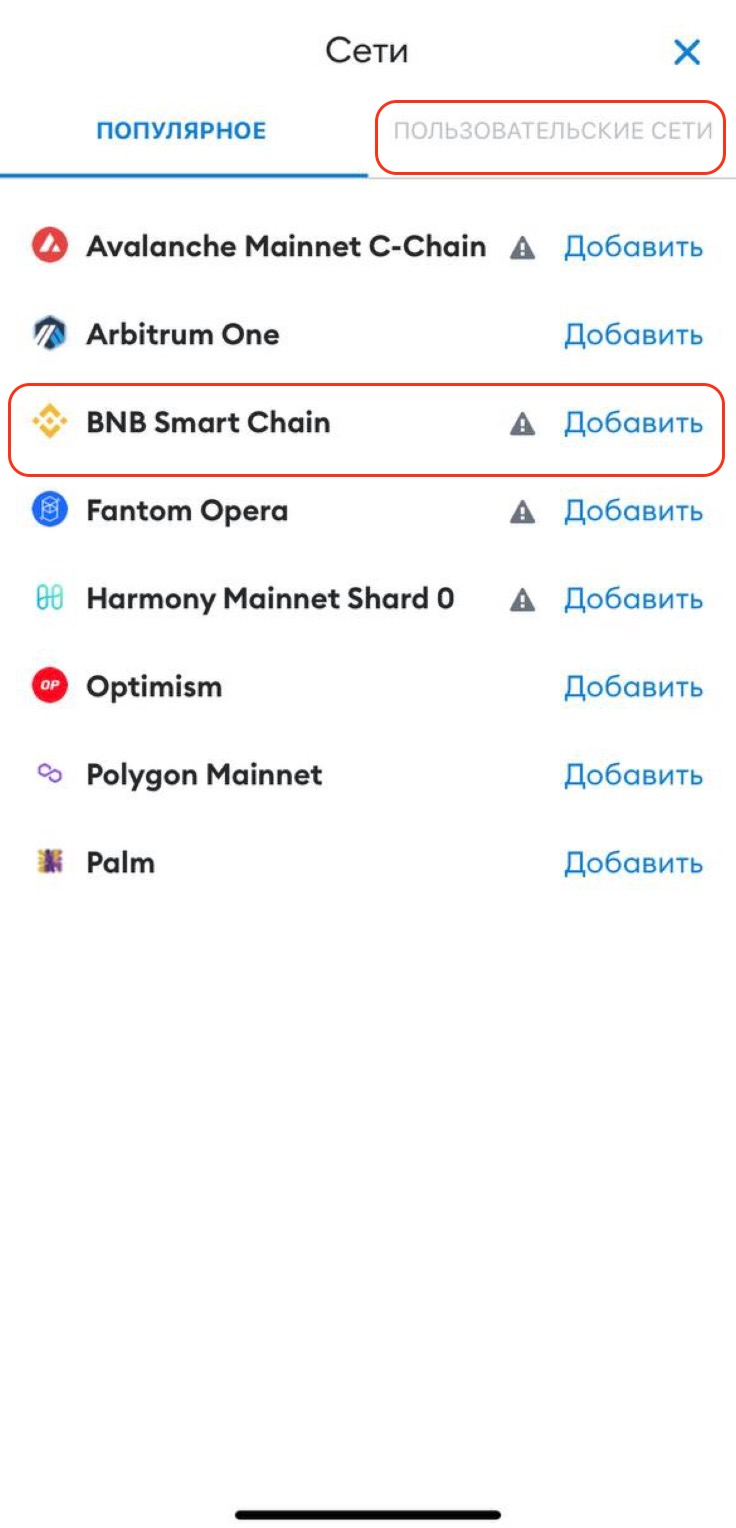 В разделе “Пользовательские сети” укажите параметры сети BNB Smart Chain вручную и нажмите “Добавить”.