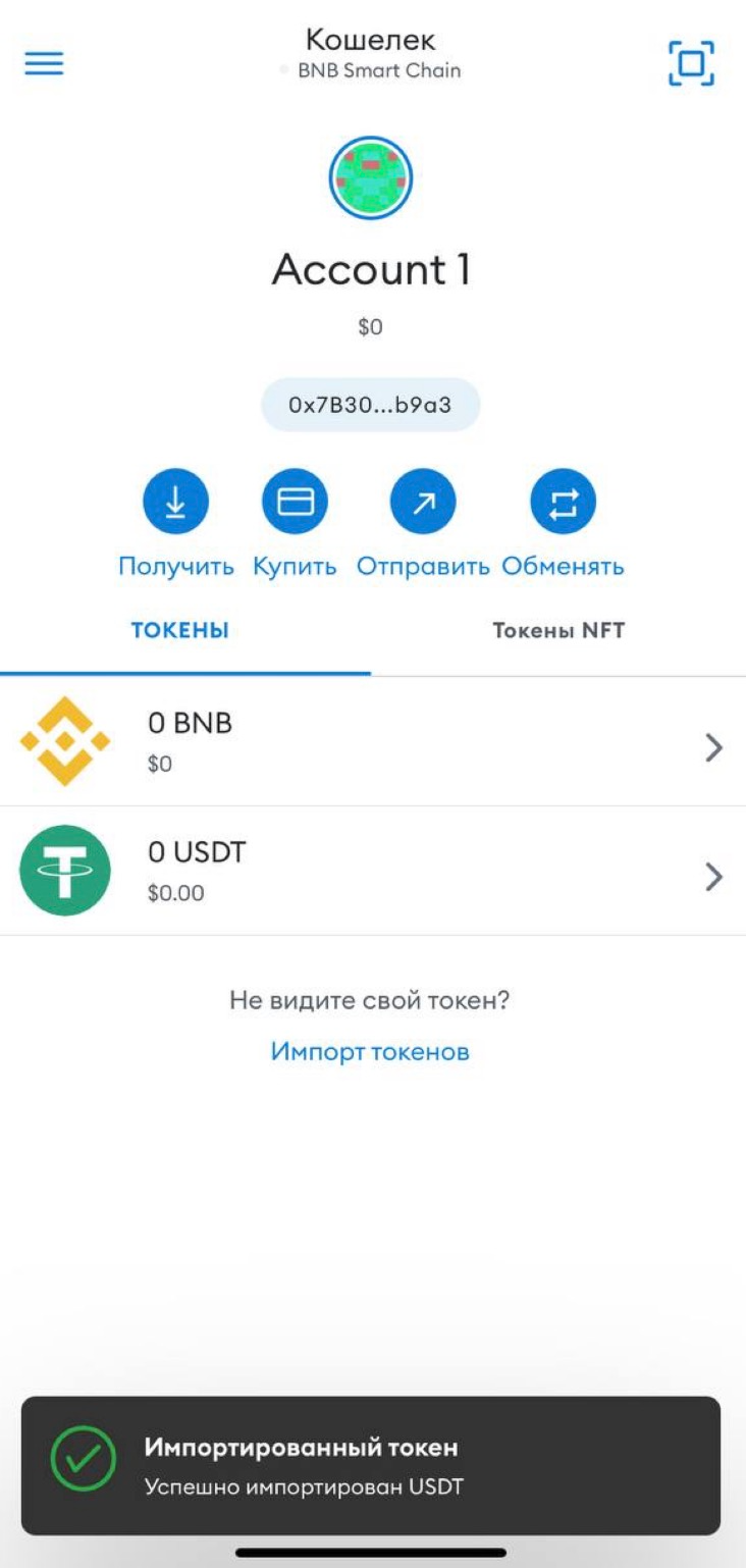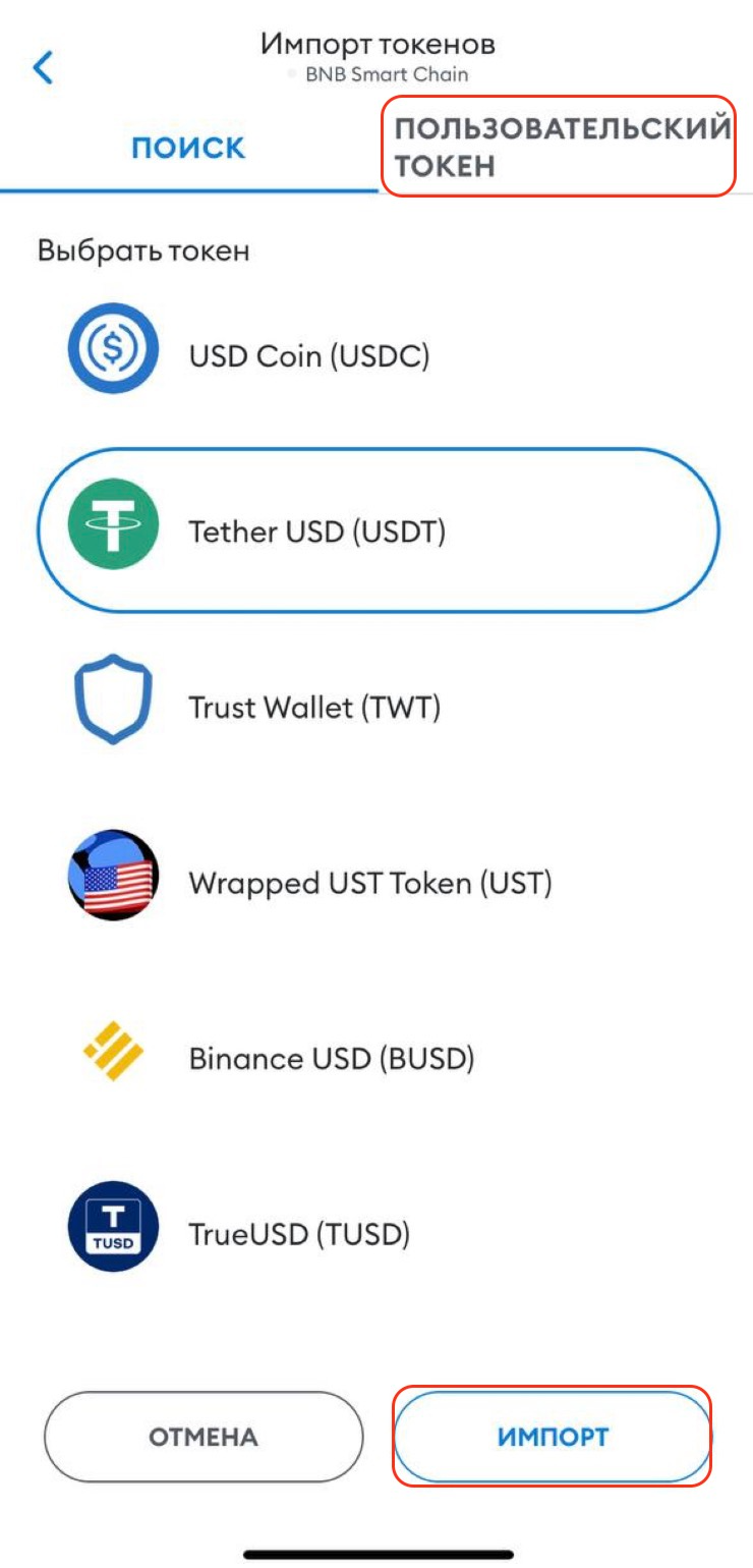 Выберите USDT и нажмите “Импорт”.