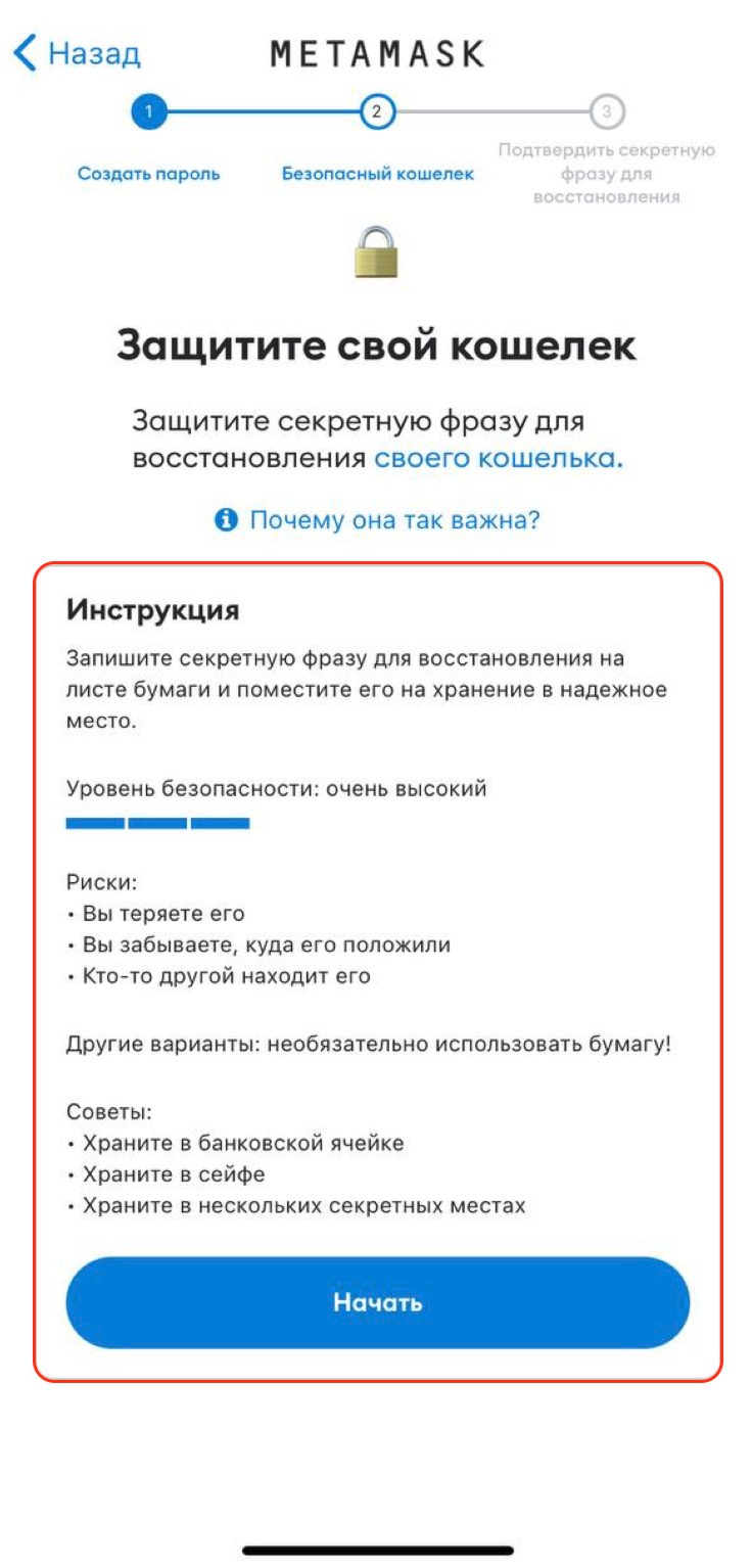 Для продолжения создания кошелька нажмите “Начать” и подтвердите действие, введя пароль.