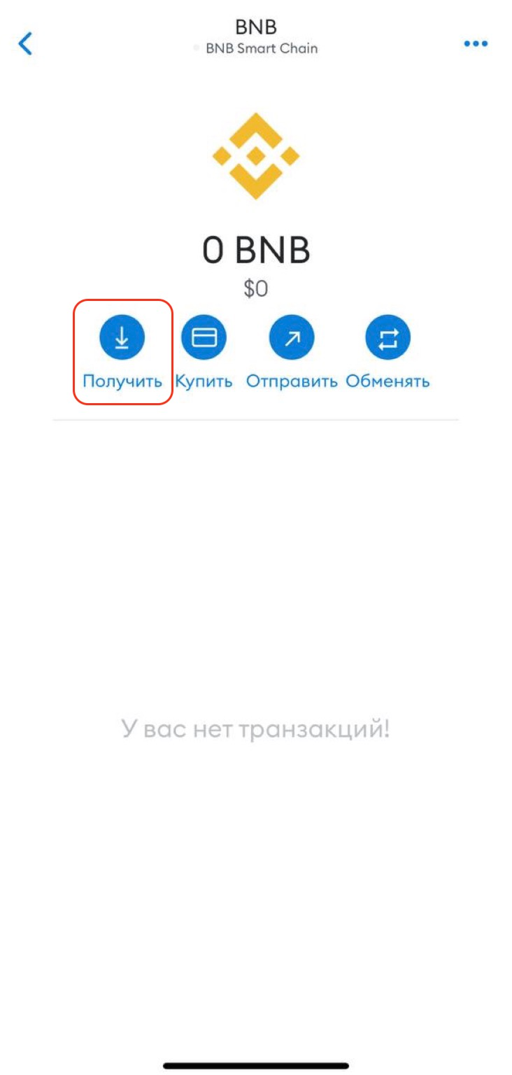 Чтобы получить адрес, нажмите на BNB и затем “Получить”.