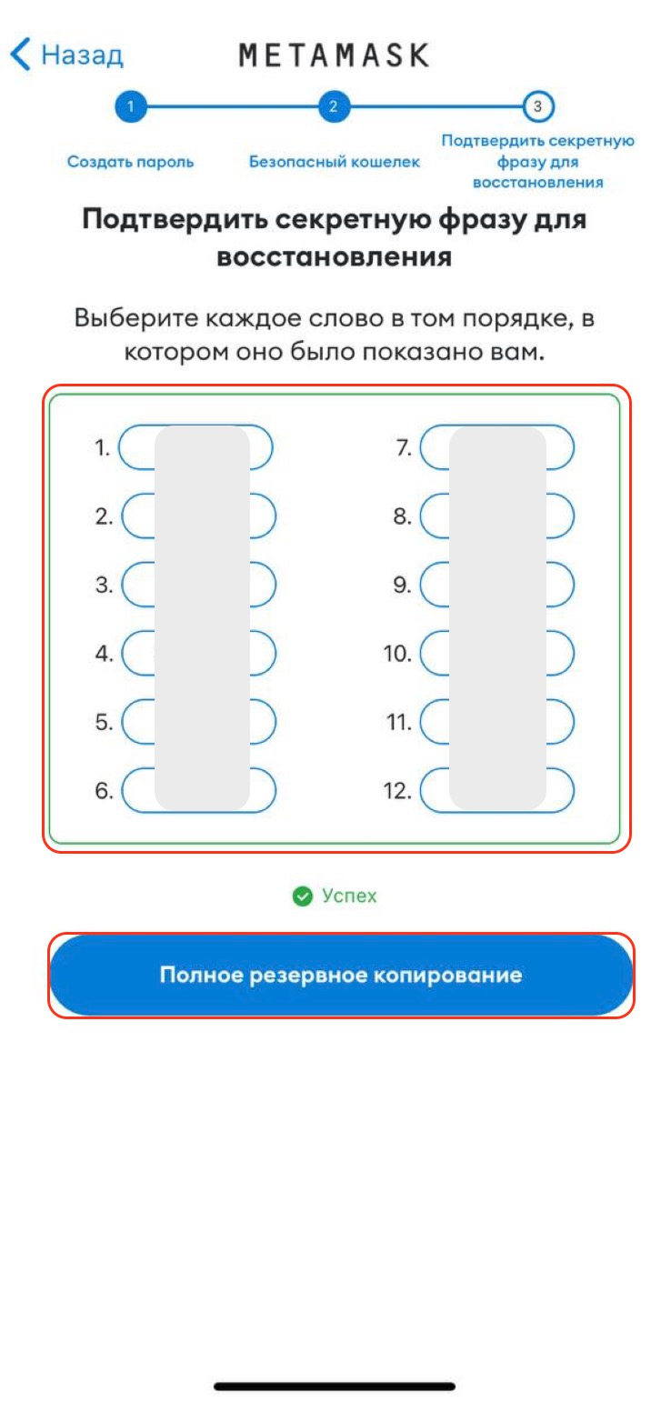 Запишите секретную фразу кошелька в том же порядке, в каком вы ее получили и без ошибок — все 12 слов.