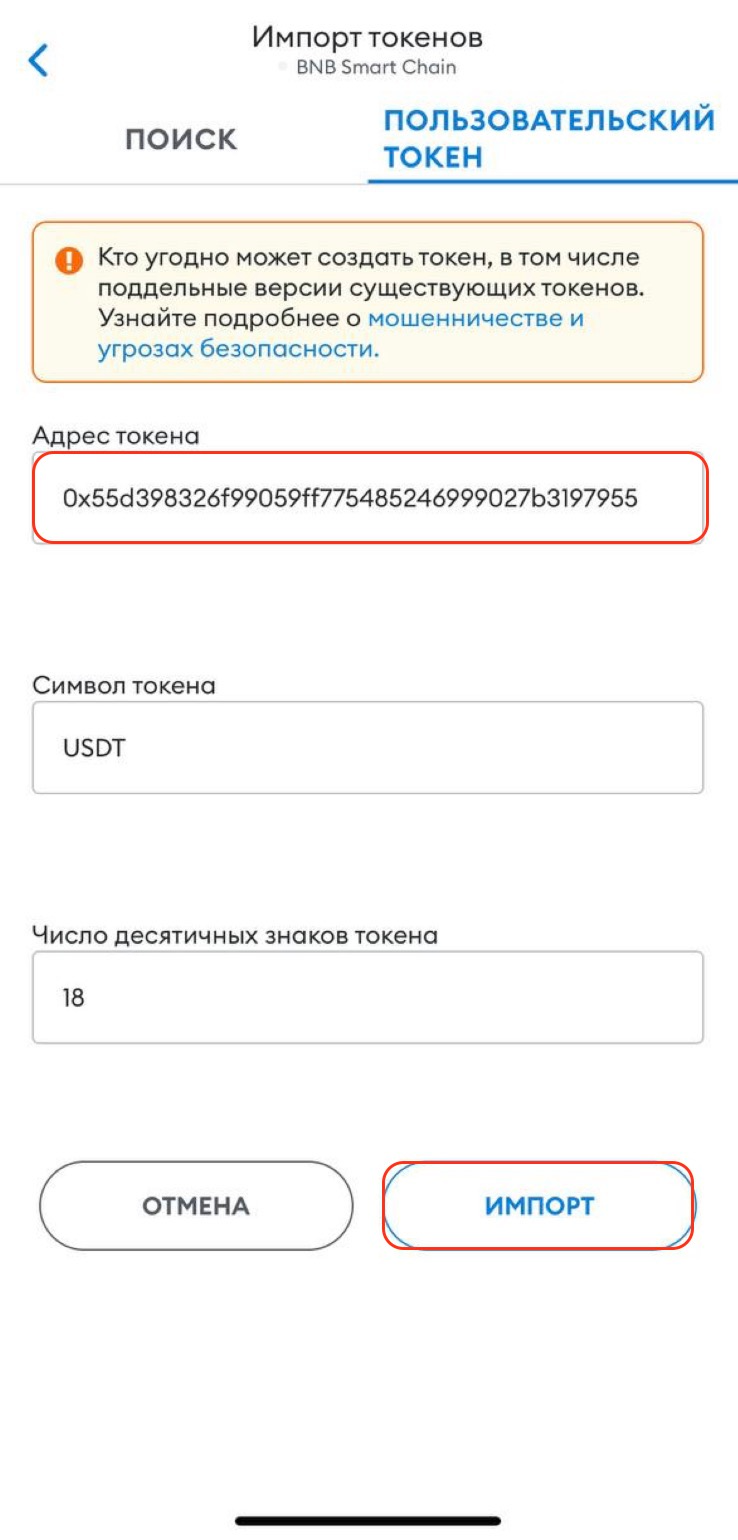 В строке “Адрес токена” введите адрес смарт-контракта USDT в сети BNB Smart Chain (BEP-20): 0x55d398326f99059ff775485246999027b3197955