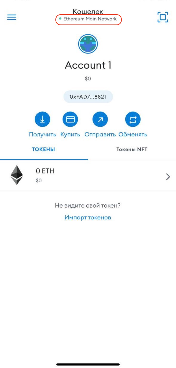 Перейдите в кошелек и на основном экране нажмите на наименование сети. По умолчанию после создания кошелька установлена сеть Ethereum Main Network.