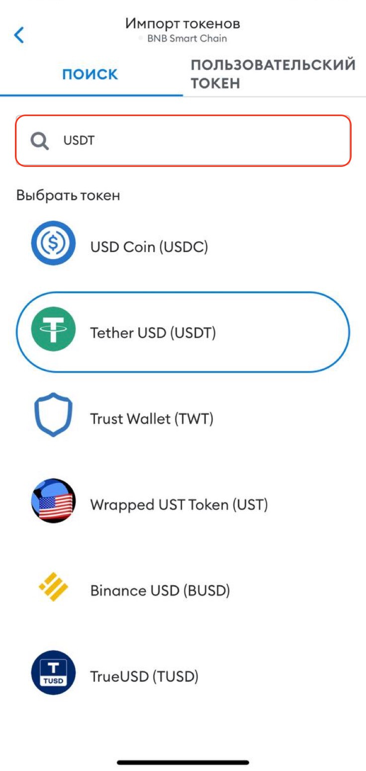 Добавление USDT в список активов кошелька