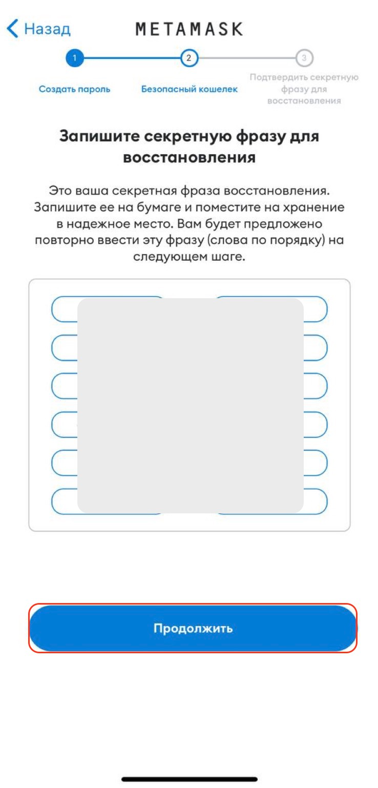 Нажмите “Продолжить” если убеждены, что секретная фраза записана корректно.
