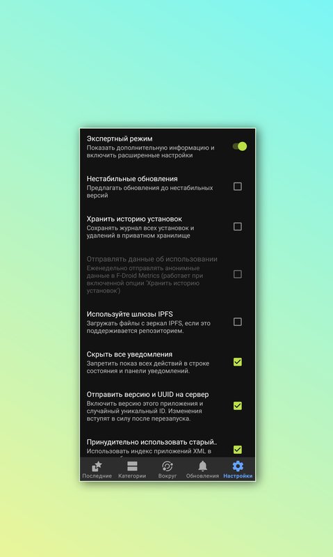 Ещё одна интересная настройка в данном маркете, это "Экспертный режим", тут множество настроек как для приватности, так и для стабильности приложений которые вы будете устанавливать, сам список и как настроены функции в этом разделе будет показано на скриншоте ниже.