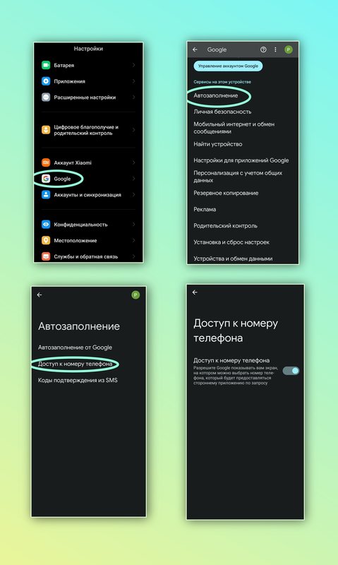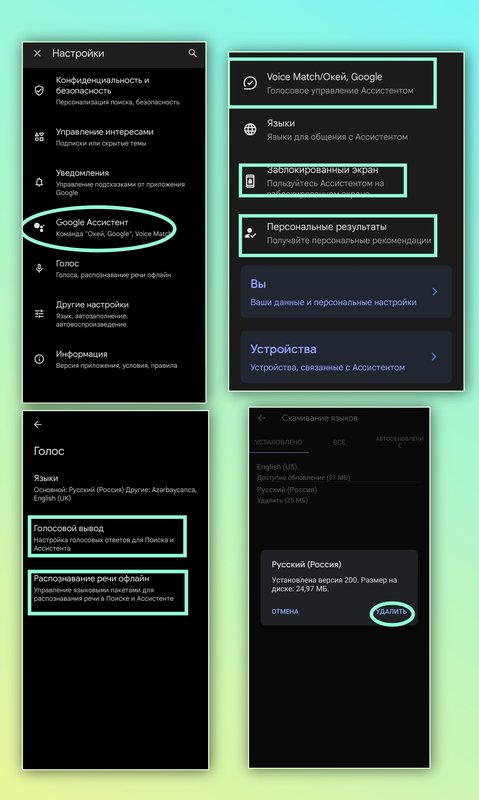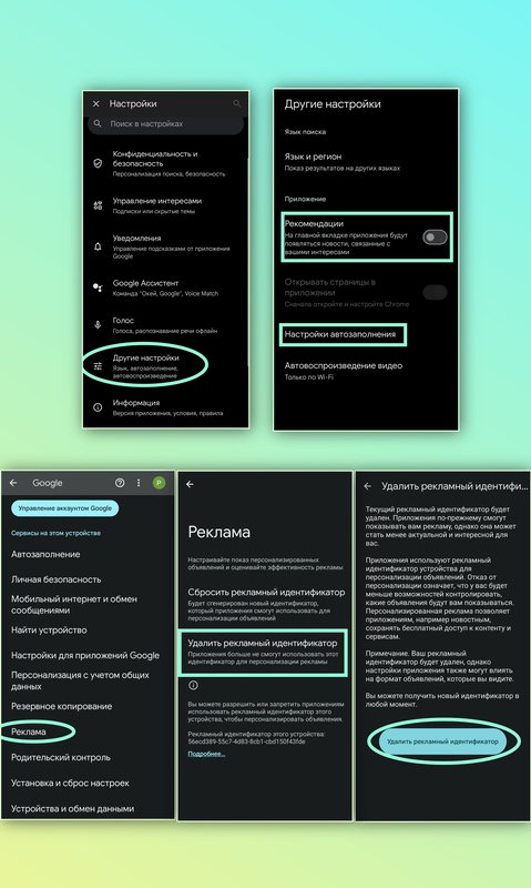 Открываем главное меню настроек, листаем в самый низ, находим отдельный раздел "Google", переходим к нему. Первый интересующий нас паразит это "Автозаполнение", перешли и нажали на "Доступ к номеру телефона", отключаем доступ и возвращаемся обратно к списку этого раздела. Следующим нужно проверить в этом списке "Найти устройство", бегунок тут должен быть уже выключен, если всё же он включён, отключаем и переходим назад. Теперь открываем "Настройки для приложений Google" тут нам нужен только подраздел под названием "Поиск, ассистент и голосовые управления", в открытом нами списке выбираем первым "Конфиденциальность и безопасность", а далее "Персональные результаты", отключаем бегунок в правом верхнем углу и возвращаемся два раза назад. Переходим к настройкам "Google Ассистент", отключаем перечисленные сервисы как на скриншотах "Голосовое управление ассистентом", "Заблокированный экран", "Персональные результаты".