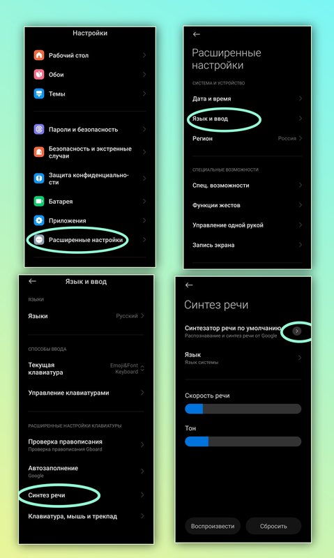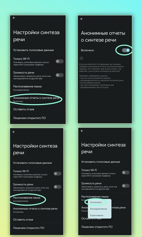 Открываем главное меню настроек телефона, видим фразу "Расширенные настройки" и переходим к ним, тут нажимаем "Язык и ввод" и потом "Синтез речи", после перехода в синтез речи, жмëм на стрелку справа в верху как указано на скриншоте и переходим к отключению вредителей, а именно "Анонимные отчёты о синтезе речи", под видом этих отчётов и осуществляется отправка вашей речи и часто произнесённых слов, фраз для определения рекламного идентификатора и сбора других данных. В этом же списке отключаем "Распознование языка".