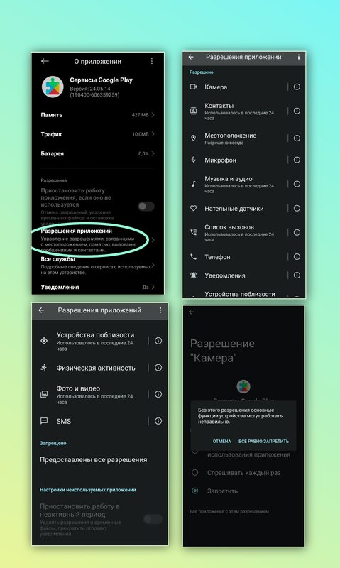 Отключаем по очереди разрешения в приложении "Сервисы Google", делается это следующим образом, переходим в раздел "Разрешения приложений" и нажимаем на вкладку "Камера", далее нажимаем "Запретить", после этого появится окно с предупреждением (ложным запугиванием), действуем решительно и нажимаем "Всё равно запретить", далее проделываем эти действия с каждым разрешением.