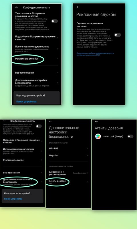 После этого ниже видим один из самых важных подразделов для нейтрализации "Рекламные службы", заходим и видим "Персонализированная реклама", отключаем бегунок. Возвращаемся назад, переходим к вкладке в самом низу под названием "Дополнительные настройки безопасности", тут нам нужно "Агенты доверия", переводим сервис "Smart Lock (Google)" в не рабочее положение.