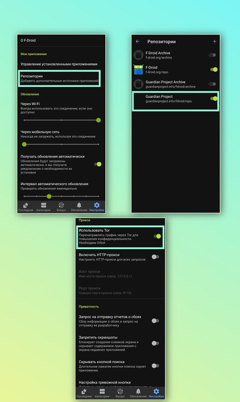 Чтобы анонимно скачивать приложения с F-Droid, переходим во вкладку "Настройки" и включаем репозиторий "Guardian Project", переходим во вкладку "Категории" обновляем потянув страницу сверху вниз, теперь нам доступен для скачивания Orbot, а также другие приложения от Guardian Project , скачиваем Orbot, переходим обратно в маркет и включаем "Использовать Tor". По моему опыту и сложившемуся мнению, вместо функции "Использовать Tor", лучше использовать приложение "InviZible Pro", о нём будет более подробно рассказано в данной статье в главе "Приложения".