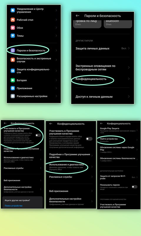 Этот раздел является одним из самых злобных нарушителей анонимности пользователей. После перехода находим подраздел "Конфиденциальность" и переходим к нему. Первым на очереди у нас вкладка "Найти устройство", отключаем эту функцию. Далее будут вкладки, которые могут быть не на всех смартфонов, а только бренда Xiaomi, эти вкладки называются "Учавствовать в программе улучшения качества" и "Использование и диагностика", отключаем при их наличии.