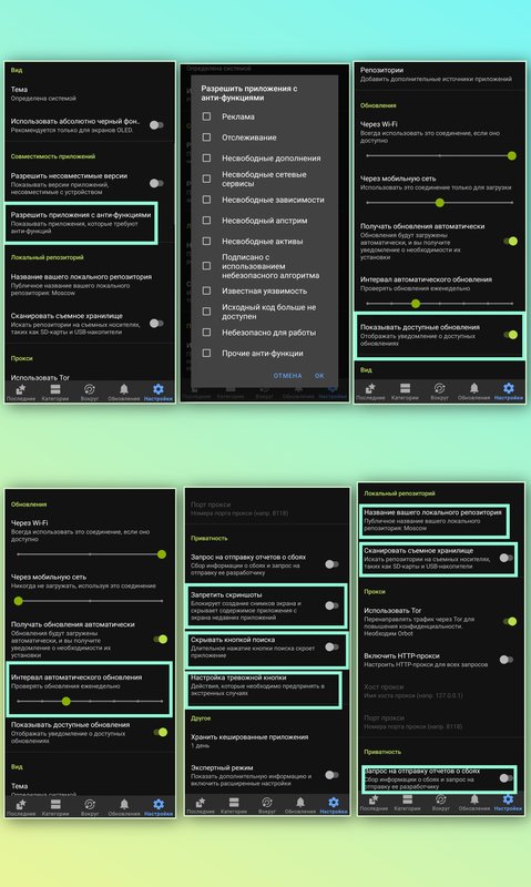 Повысить приватность пользования приложением, можно следующим образом. Переходим в настройки, выбираем вкладку "Разрешить приложения с анти-функциями", будет отображëн список для отключения/включения тех или иных функций приватности и безопасности, настраивает каждый под себя. Далее отключаем уведомления "Показывать доступные обновления". Смотрим дальше, "Название вашего локального репозитория", тут можем изменить на любое другое название, так как изначально туда будет подтянуто название из настроек, где подписано название вашего телефона, чуть ниже отключаем "Сканирование локального хранилища". Переходим к следующей позиции и отключаем "Запрос на отправку отчётов о сбоях", спускаемся ниже и активируем "Запретить скриншоты".