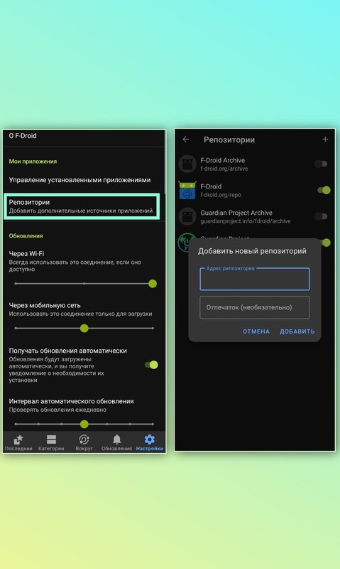 Немного подробнее на тему репозиториев в F-Droid, каждый пользователь может развернуть свой репозиторий, т.е хранилище для раздачи приложений, из которого другие пользователи смогут их скачать. После установки маркета нам доступен только стандартный репозиторий от разработчиков ф-дроид, в этот репозиторий уже включены проверенные приложения всех категорий на любой вкус и цвет, а также в настройках дополнительно присутствует возможность включения репозитория от Guardian Project, приложения разработчиков этого проекта направлены исключительно на безопасность и анонимность, обязательно его включаем. Также имеется возможность добавления других репозиториев, найти их можно в клирнете, в том числе на ГитХаб. Добавление новых репозиториев осуществляется во вкладке "Репозитории" в разделе "Настройки" в ручном режиме, для этого необходимо нажать на знак плюс в правом верхнем углу, затем добавить ссылку в строку открывшегося окна.