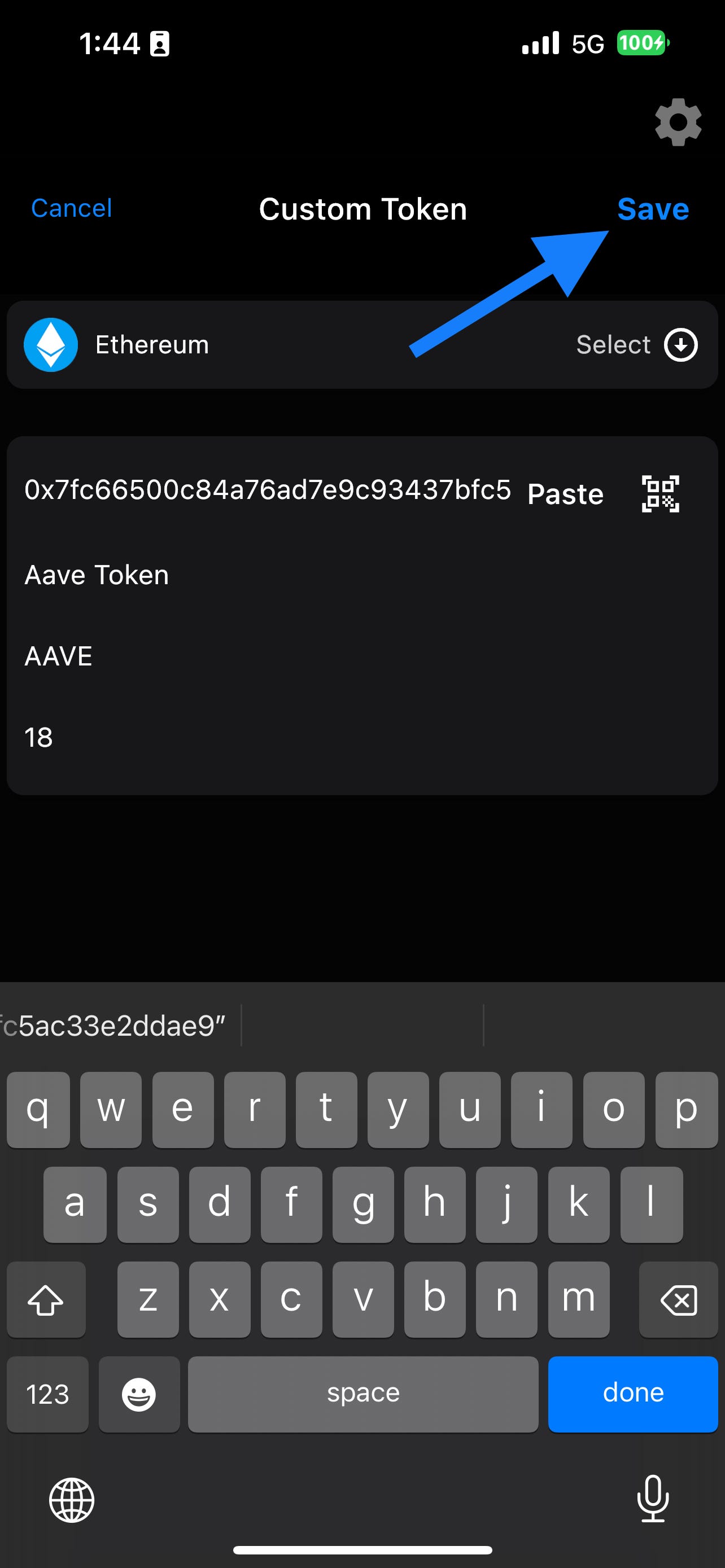 In all token lists, click the “custom” button to enter your own custom token to Futura