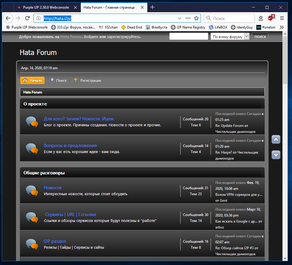 Пробуем перейти на наш форум http://hata.i2p/. Интересный момент, что меня не перекидывало на джамп-сервисы, по всей видимости, в адресной книге роутера i2pd, это есть этот адрес, но даже если и перекидывало, то действия такие же, как было описано выше. И по моим наблюдениям, этот клиент быстрее находит пиров.