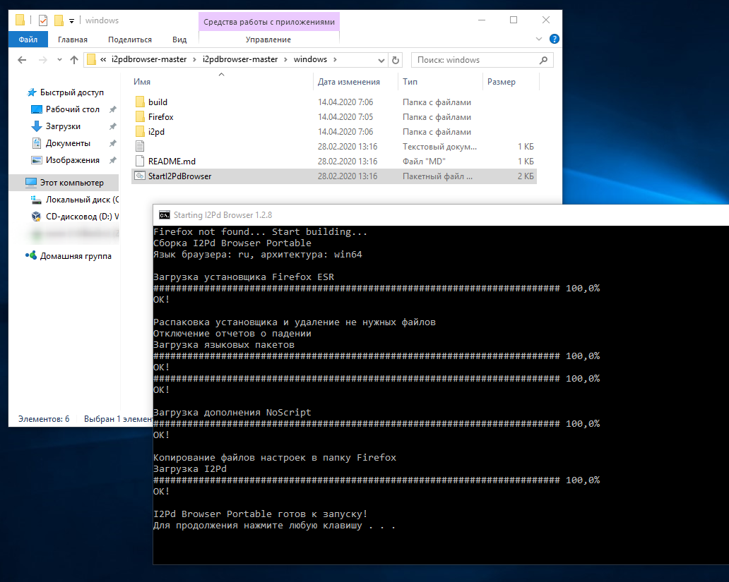 После скачивания в директории Windows, запускаем скрипт StartI2PdBrowser.bat, он все скачает и соберет: