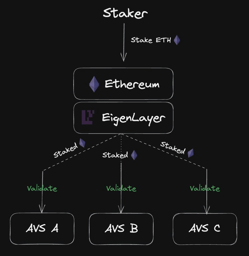This problem is further exacerbated by the fact that each dApp is often isolated and, therefore, more vulnerable. Instead of securing each dApp individually, EigenLayer introduces Actively Validated Services (AVS), enabling the security of multiple applications simultaneously through the liquidity of restaked Ethereum.