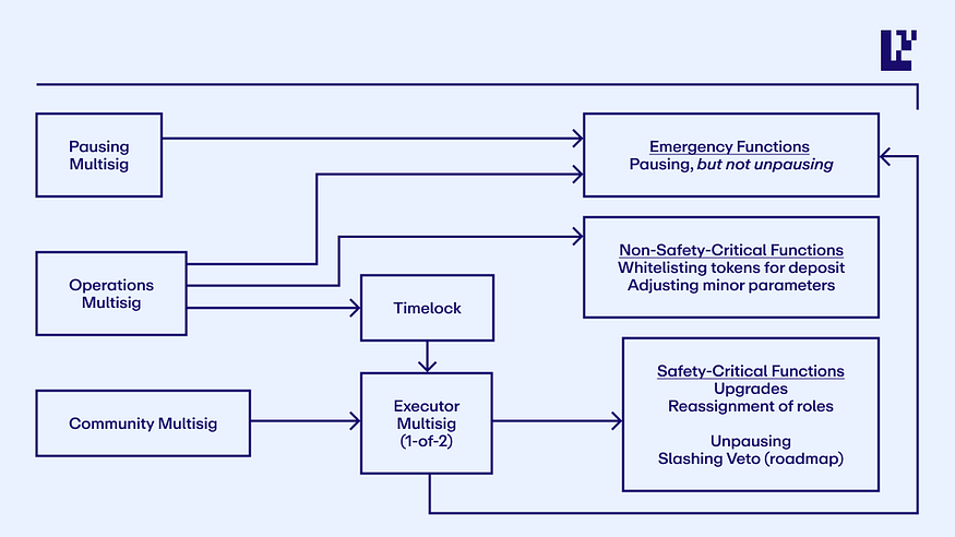 Pauser Multisig: Additionally, there is a less influential 1/14 multisig that can only suspend the protocol. That is, one participant’s decision is enough to temporarily suspend the protocol’s operations.