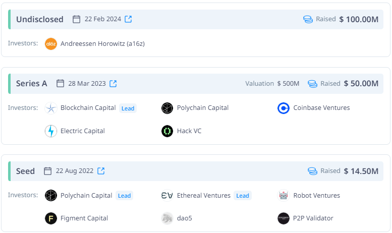 - Investors: Blockchain Capital, Polychain Capital, Coinbase Ventures, Electric Capital, Hack VC. This round saw fewer funds involved and three Tier-1 funds, which is a green flag. It can be assumed that the product developed over the course of less than a year and positioned itself as a leader in future restaking infrastructure. Notably, this round took place at a valuation of $500 million (12x), which is concerning, as once vesting begins, investors will be incentivized to sell their tokens and recoup their investments.