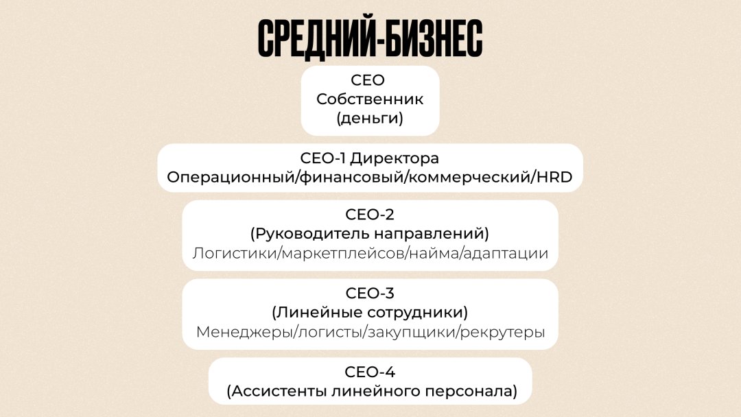 - Руководители направлений (руки и голова): Это ваши ключевые специалисты (например, по маркетплейсам, логистике), которые и разрабатывают стратегию для своего направления, и сами же ее реализуют.