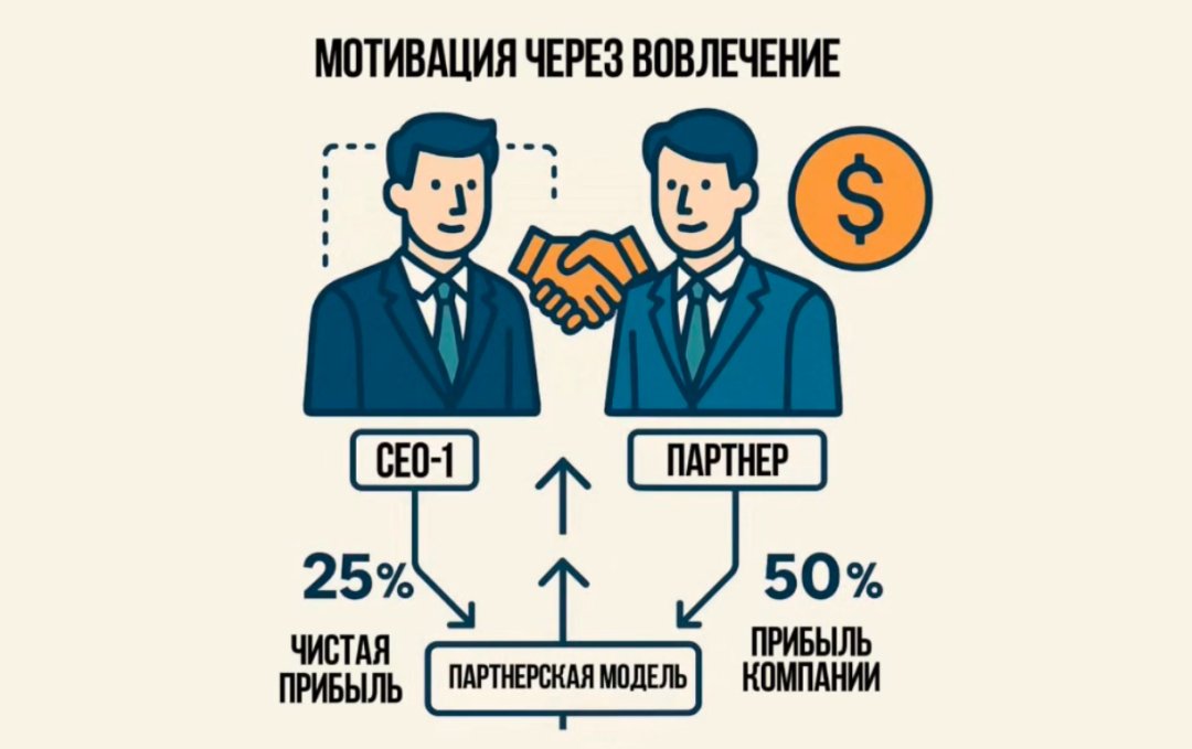 Для быстрого роста отлично работает партнерская модель. Ее суть в том, чтобы предложить вашему руководителю направления (CEO-1) не просто процент, а партнерские условия.