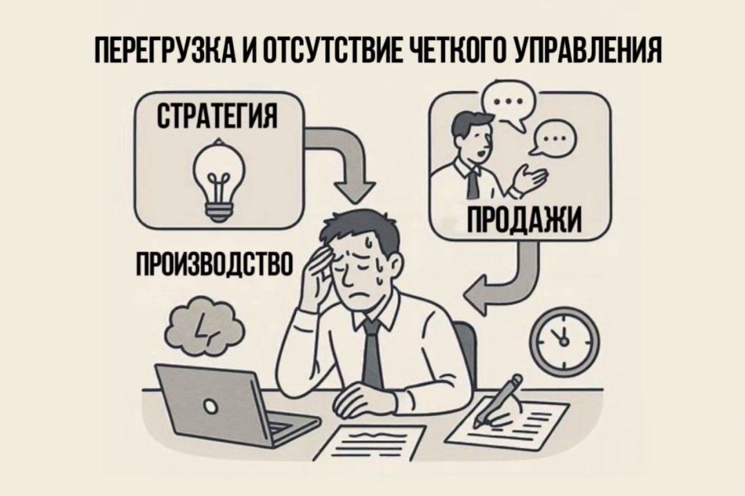 1. Перегрузка и отсутствие четкого управления. Собственник выступает в роли и стратега, и продажника, и производственника. Это приводит к выгоранию и невозможности увидеть картину в целом.