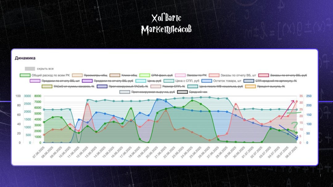 Это ключевой показатель эффективности продвижения: Total Advertising Cost of Sales = рекламные расходы ÷ расчётную выручку из заказов с учётом процента выкупа. Только он даёт понимание, какой % от всей выручки уходит на продвижение. Если TACoS превышает валовую маржу по товару — вы уходите в минус по каждому проданному SKU.
