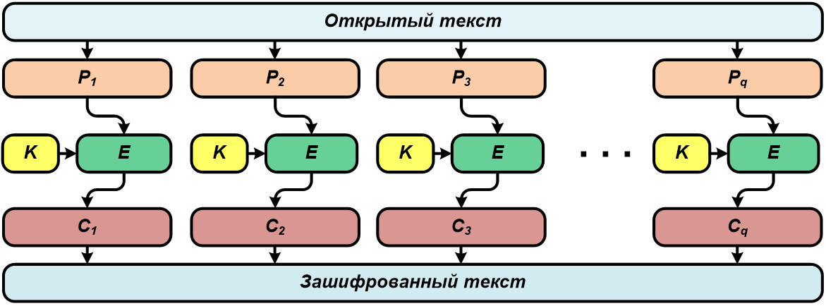 Здесь все достаточно просто: весь исходный текст делится на блоки, в случае необходимости производится дополнение последнего блока, далее каждый блок шифруется с применением нужного алгоритма блочного шифрования, и в итоге получившиеся зашифрованные блоки и будут составлять зашифрованное сообщение. На схеме ниже буквами P обозначены блоки исходного текста, K — ключ шифрования, E — алгоритм блочного шифрования в режиме зашифровывания, C — зашифрованные блоки.