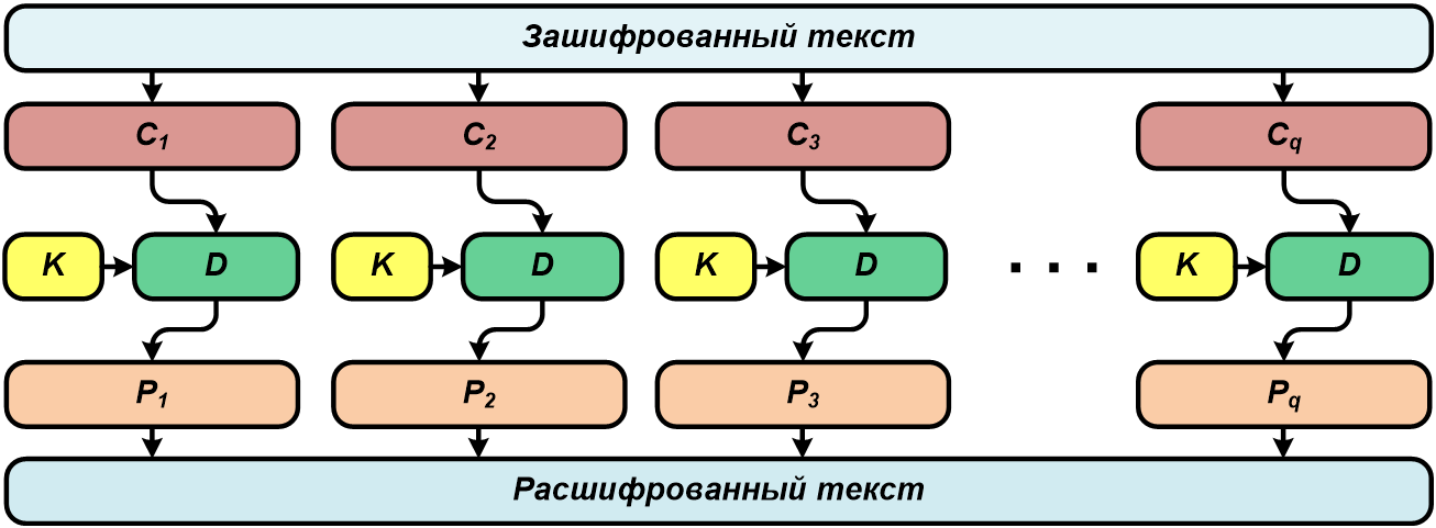 - Это режим простой замены, в котором одинаковые фрагменты открытого текста дают идентичные блоки шифртекста