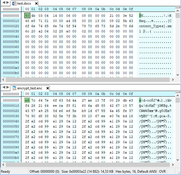 Режим простой замены достаточно несложен в реализации, однако имеет один весьма существенный недостаток: если мы будем шифровать сообщение, которое содержит в себе одинаковые или повторяющиеся блоки, то на выходе мы тоже получим зашифрованные одинаковые или повторяющиеся блоки. Этот недостаток дает возможность вскрыть структуру исходного сообщения. На примере ниже повторяющиеся блоки хорошо видны (сверху исходный текст, снизу зашифрованный).