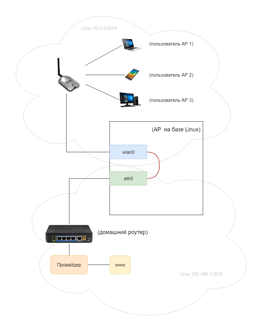 Теперь подключение к AP становится возможным с любых устройств. Чтобы наша точка наконец заработала в обычном режиме, осталось ответить на главный вопрос: откуда точка будет брать доступ в интернет. Для получения ответа предлагаю взглянуть на скрин ниже. Большинство читателей, так или иначе соприкасавшихся с настройкой сетей, заметят на нем достаточно привычную схему связывания сетей. Именно этот способ мы и будем использовать.