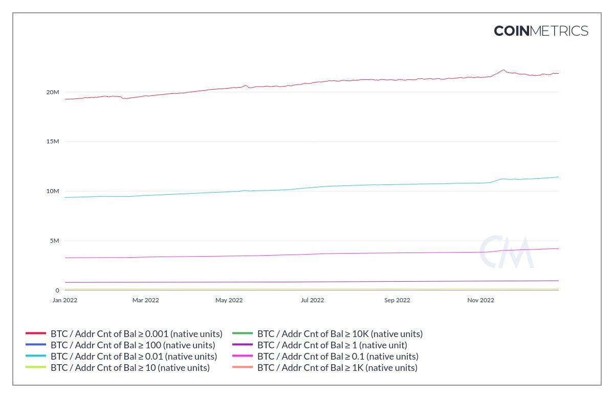 Coinmetrics приготовил сводную таблицу по Bitcoin, Ethereum и стейблкоинам. Спекуляция, судя по блокчейну Биткоина, была менее активной в 2022 году, при том что количество монеток (UTXO) в протоколе увеличилось.