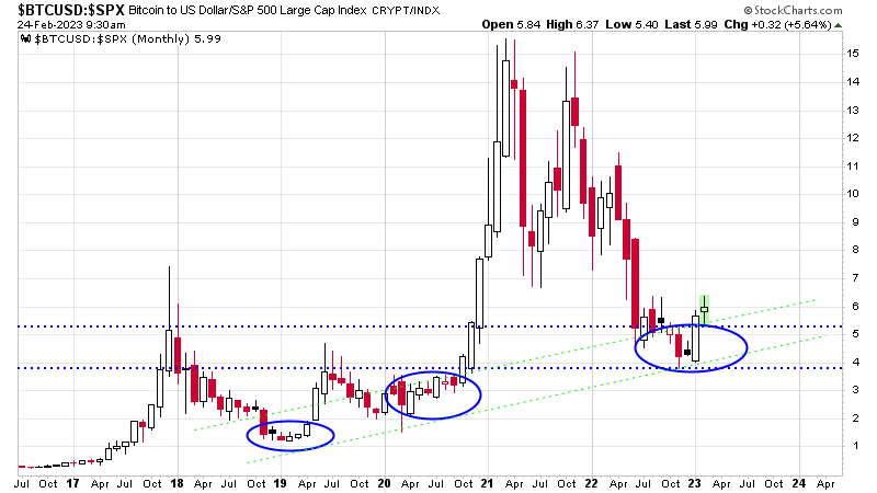 Наконец, для самых терпеливых: SP500, оценённый в биткоинах, может указывать на разрыв корелляции с фондовым рынком.