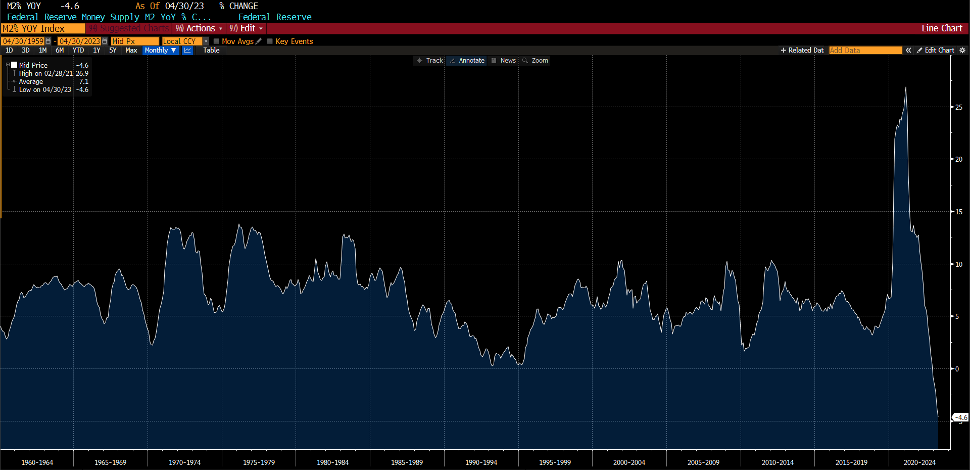 Но нужно отметить ньюанс графика выше: он имеет в виду куда более долгую перспективу. В течение одного года мы наблюдаем очень резкое сокращение M2. Ещё одна вероятная причина резкого пике М2 — пустая казна США, поскольку в отношении новых займов правительство договорилось только к четвергу.